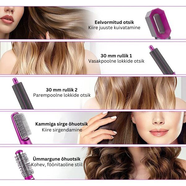 See sobib ideaalselt kõikidele juuksetüüpidele ning 5 erinevat otsikut võimaldavad teil juukseid kuivatada, lokitada, sirgendada, volüümi lisada ja kujundada.