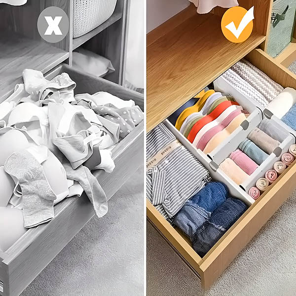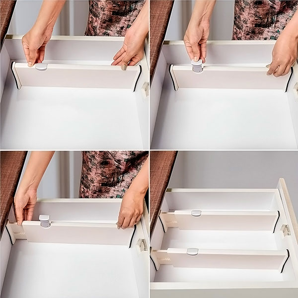 Olgu tegemist köögiriistade, vannitoa tarvikute või sokkidega magamistoas – neid jagajaid saab reguleerida 28 cm-st kuni 45 cm-ni, et need sobiksid enamiku sahtlitega. Sa saad oma ruumi kohandada täpselt nii, nagu vaja.